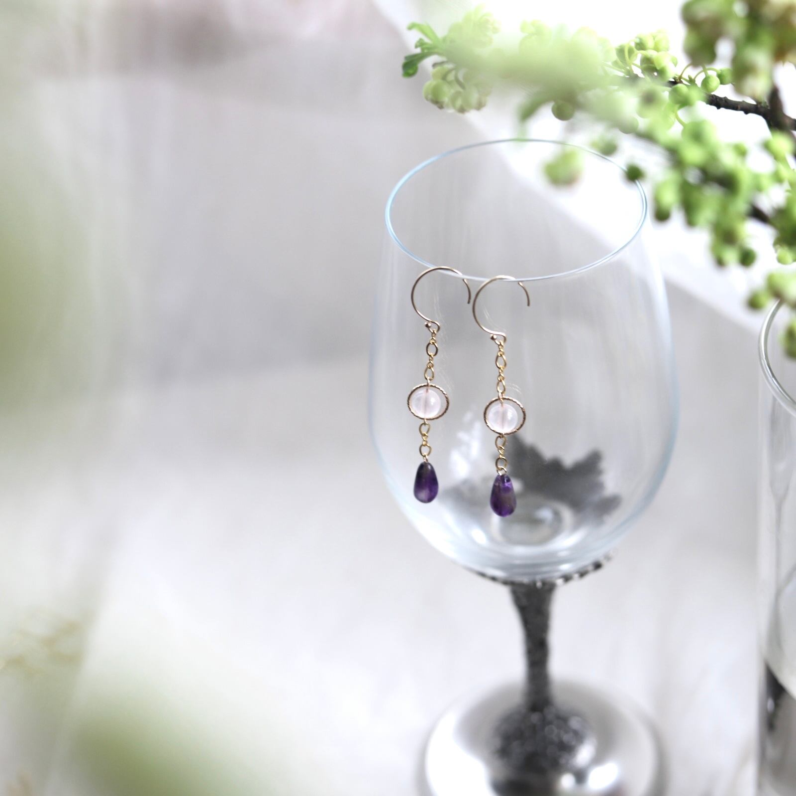 ローズクォーツとアメジストのピアス 14KGF